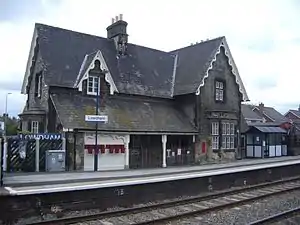 The buildings originally comprised a combined station building and station master's house, a weighbridge hut at the entrance to the goods yard, a goods shed, and stables for the horses that drew the drays to deliver goods. A waiting room, a porter's room and a lamp hut were on the opposite platform from the station building, and a signal box across the road on that side, next to the level crossing. The signal box was opened on 14 June 1896.[4] This Midland Railway Type 2b box was the oldest on the line when abolished in 2016.[5]