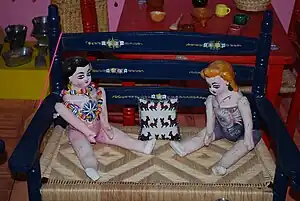 A Lupita doll is a kind of papier-mâché doll which was made primarily by the poor along with those from straw, wood and rags.[1] The papier-mâché technique is properly called cartonería, making a very hard surface when dry. This technique has been used to make a number of crafts up to this day, most notably to make alebrijes and skeletal and other figures for Day of the Dead.[2] The dolls are usually created with the help of molds, one for the head and torso and others for the arms and legs, with the strips of paper and paste layered on thickly. When the five pieces are dry, holes are bored into them in order to connect the arms and legs. The two arms are connected to the body with a single cord that extends from one upper arm, through the torso, to the other upper arm, with knots visible on the upper arms. The legs are attached similarly. This allows the arms and legs to be moved from the shoulders and hips respectively. Traditional Lupitas are painted in various flesh tones and with other colors to simulate clothing or underwear. On traditional dolls, flower designs of Otomi origin are also painted. Those painted with underwear are then dressed in some kind of costume.[2][3]