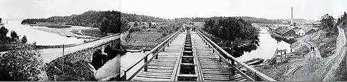 Looking across original wooden Lysaker Bridge at Lysaker Station in 1890