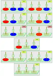 Note that in contrast to the other variations and the general rule, MToH variations NNR and NBR end with the red sides of the disks facing upwards. This is a natural consequence of the destination post being colored red.