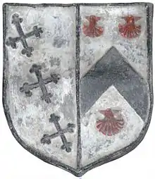 - ↑ Pole, Sir William (d.1635), Collections Towards a Description of the County of Devon, Sir John-William de la Pole (ed.), London, 1791, p.460, with tincture of lion unspecified thus presumed sable, an unusual tincture for a field ermine, thus shown here gules, as in arms of de Cornwall, Earl of Cornwall