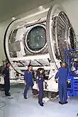 After final stages of manufacturing, systems testing and launch checkout, all ISS components are loaded into a payload transfer container in the shape of the Space Shuttle payload bay. This container safely carries the component in its launch configuration until it is hoisted vertically at the launch pad gantry for transfer to the Space Shuttle orbiter for launch and in-orbit assembly of the International Space Station.[26]