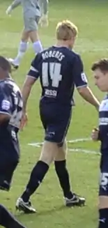 He remained at Fleetwood for the club's first season in League One, starting the season playing a peripheral role, playing in just one match in the opening two months of the season.[94][95] Roberts made his first league appearance of the season on 4 October 2014, playing the whole match as Fleetwood defeated Port Vale 1–0 at Highbury Stadium.[94][96] After playing the whole 90 minutes in a 1–0 away victory at Yeovil Town, he was a regular in the starting line-up for the remainder of the season.[94] On the final day of the regular season, he scored Fleetwood's second goal in the club's 2–1 victory against Port Vale on 3 May 2015, with Roberts scoring from a yard out after David Ball centred Josh Morris' cross.[97] The game was Roberts' final game for Fleetwood, as the club consolidated their place in League One after finishing in 10th place.[94][98] He made 72 appearances for Fleetwood in all competitions over his two years with the club, scoring six times.[95] Roberts was released by Fleetwood upon the expiry of his contract in May 2015, one of 14 first team players to be released, with Fleetwood manager Graham Alexander stating the club's "drive had shifted to focus on youth development".[99]