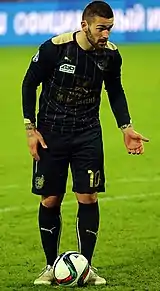 On 14 January 2018, he opened the score in a 3–1 home win game against PAS Giannina.[41] On 27 January he scored in a 2–0 home win game against Lamia.[42] On 4 March 2018, he scored with a head in a brilliant right-wing cross from Rodrigo Galo, sealing a 1–0 home win against rivals Panionios.[43] In his first season with AEK Athens he won the Super League,[44] but lost the Greek Cup to PAOK,[45] managing to reach the Round of 32 of the Europa League, where they were eliminated by Dynamo Kyiv.[46]
