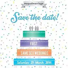 The Marriage (Same Sex Couples) Act 2013 (Commencement No. 2 and Transitional Provision) Order 2014 brought into force the vast majority of the provisions which allowed same-sex couples to marry on 13 March 2014. As the law requires couples to wait at least 16 days after giving notice to the local register office before a marriage ceremony can take place, the first marriages took place on 29 March 2014. An exception was where the Registrar General has waived the notice period because one member of the couple was seriously ill and not expected to recover. Such marriages could take place at any time after 13 March 2014.[31] Same-sex couples who married abroad under foreign law and who were previously treated as civil partners were recognised as married as of 13 March 2014.[32][33] The provisions which came into force on 13 March 2014 were: