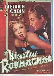 Martin Roumagnac (also known as The Room Upstairs) is a 1946 French crime film directed by Georges Lacombe. It tells the story of a builder in a small town who falls for a glamorous but treacherous femme fatale, with tragic results for both. It is notable as the only occasion in which the two major stars Jean Gabin and Marlene Dietrich, lovers in real life, appeared together on screen.