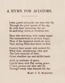 Mary Christian Dundas Hamilton (24 May 1850 - 10 June 1943) was a Scottish writer and poet. She is known for writing A Hymn for Aviators (1915).[1] The music to this hymn was composed by Charles Hubert Parry. Hamilton's verse was printed in The Times of London in 1915 and was also included in the anthology A Book of Verse of the Great War by W. Reginald Wheeler, published by Yale University in 1917.[2]
