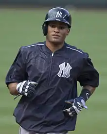 After starting 2015 with the Trenton Thunder of the Double-A Eastern League, the Yankees promoted Williams to the Scranton/Wilkes-Barre RailRiders of the Triple-A International League on May 20.[12] The Yankees promoted Williams to the major leagues on June 11.[13] In his major league debut on June 12, Williams hit a home run in his second at-bat, which was his first Major League hit.[14] Williams separated his right shoulder in a game on a June 19 and went on the disabled list.[15][16] He had season-ending shoulder surgery on August 7.[17]