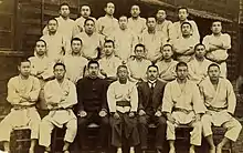 Okuda didn't participate further in the Kodokan-Totsuka rivalry, and in 1893 he moved his field of activity to the Iwate Prefecture by invitation of governor Ichizo Hattori.[4] As a consequence, he was not among the jujutsu masters gathered by Kano at the Dai Nippon Butoku Kai to inaugurate its jujutsu division in 1895 either. However, Okuda would join at some point, being granted the title of honorary judo master (柔道範士, judo hanshi).[1][2] In 1901, he opened a judo dojo in the city of Morioka, and he became an usual attender of tournaments and events while keeping his police teacher job.[1][4] His high knowledge and personal approach to throws were popularly nicknamed his "assassination technique" (殺気の技, sakki no waza), possibly in reference to his purported participation in the killings of the Shinsengumi.[1][3]