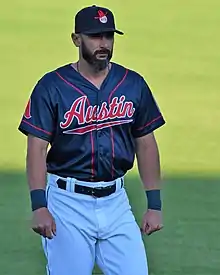The Cardinals made Carpenter their primary first baseman to begin the 2017 season. He served a one-game suspension on April 25 of a series opener versus the Toronto Blue Jays for having bumped umpire John Tumpane two days prior, when he had been ejected for arguing a pair of called strikes in the seventh inning.[77] Carpenter hit a walk-off grand slam, and the first grand slam of his career, in the 11th inning of an 8−4 victory, in the first game of a split double-header versus the Blue Jays on April 27.[78] He homered on May 14 versus Arrieta, then with the Cubs, to end an 0-for-28 and nine-strikeout slump in their matchups.[79] On May 17 versus the Boston Red Sox, Carpenter's sacrifice fly to shortstop Xander Bogaerts—the third of his career to the shortstop position—made him the only player since at least 1970 to accomplish the feat.[80]