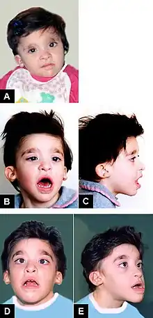 | Mowat–Wilson syndrome, clinical features of Patient 2 at age: (A) 1 year and 6 months; (B–C) 3 years and 5 months; (D–E) 8 years and 1 month. | |