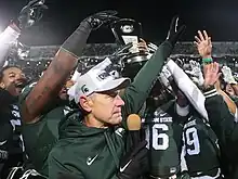 He is considered a defensive-minded coach and has been on the coaching staffs of Glen Mason, Jim Tressel and Nick Saban. On September 21, 2019, Dantonio became Michigan State's winningest coach with a 31–10 victory over Northwestern that gave him his 110th win at the program and moved him past Duffy Daugherty.[8] As of February 2018, his contract was set to run through 2024. Dantonio made approximately $4.3 million annually.[9] On February 4, 2020, Dantonio announced that he would be stepping down as head coach and planned to move into a different role in the athletic department.