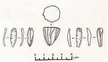 Microblade technology is a period of technological microlith development marked by the creation and use of small stone blades, which are produced by chipping silica-rich stones like chert, quartz, or obsidian. Blades are a specialized type of lithic flake that are at least twice as long as they are wide.[1] An alternate method of defining blades focuses on production features, including parallel lateral edges and dorsal scars, a lack of cortex, a prepared platform with a broad angle, and a proximal bulb of percussion.[2] Microblades are generally less than 50 mm long in their finished state.[3]