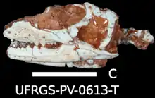 Microsphenodon is an extinct genus of sphenodontian from the Late Triassic of Brazil. The type species is Microsphenodon bonapartei.[1] It is a small sphenodontian with a skull roughly 20 mm long, and represents a unique mosaic of characteristics shared by both early diverging sphenodontians (such as a broad parietal table, multiple tooth rows on the palate, and an elongated premaxillary process) and eusphenodontian characters (full acrodont dentition, high coronoid process and anterior successional teeth, including the earliest known caniniforms in a lepidosaur). Specimens of this taxon were first identified by Bonaparte and Sues (2006) [2] but were misidentified as juvenile Clevosaurus brasiliensis, characteristics such as differences in the configuration of the teeth on the palate, and the unique form of tooth implantation seen in C. brasiliensis, helped differentiate these two co-occurring sphenodontian taxa.[1]