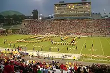 Following Crown Imperial, the band moves under cadence to form a tunnel for the football team's entrance before exiting the field to play in the stands.