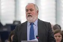 In 2014, Arias was picked by Rajoy to lead the People's Party's list in the 2014 European elections.[10] Following the elections, Spain nominated him for the Juncker Commission in August 2014.[10] By early September, European Commission President Jean-Claude Juncker assigned Arias to the office of European Commissioner for Climate Action and Energy, where he became the first single supervisor of those two policy areas.[11] He took office on 1 November 2014.[12] In this capacity, he works under the guidance of Maroš Šefčovič, the European Commission Vice President for Energy Union.