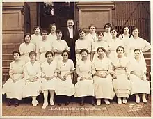 He established a music school, often referred to as conservatory, in 1910. Its first recitals took place in early 1911 at the Hull House.[11] The school changed locations as he moved to different cities. For a while, it had chapters in Brooklyn, Newark, and Elizabeth.[6] According to Petrauskas, he was dissatisfied that many students were non-Lithuanians (Jews, Russians, etc.) and therefore decided to move from New York to a larger Lithuanian community in South Boston.[1] The number of students varied from 30 to 130 in a given year. Most students took classes more as a hobby and did not graduate with a degree.[11] In total, 37 people graduated as choir masters, eight as choir masters and conductors, and six as music teachers.[1] The students included Antanas Sodeika, Rojus Mizara, Jonas Būtėnas, Marijona Rakauskaitė.[5] Between 1917 and 1920, the school published 44 volumes of Kanklės with many compositions by Petrauskas.[11] The school closed in 1924.[1]