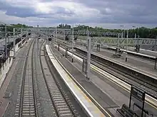 Platform 2A is a five-car south-facing bay platform,[8] originally intended for the extension of Marston Vale Line services from Bedford into Milton Keynes Central:[7] this proposal no longer appears in plans for East West Rail, being replaced by a planned service to/from Oxford (see below). Meanwhile, platform 2A is used only by exception when additional platform capacity is needed, such as when there is a service delay. To the north of the station the six lines reduce to four (two slow and two fast) and there is a mile of five-track running to the south before this also reduces back to four.[8]