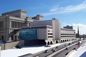 The Milwaukee County Courthouse Annex was a five-story 447-space concrete parking facility that also housed limited office space. Built in the 1960s, it extended over the three northbound lanes of Interstate 43 (I-43) just north of the Marquette Interchange. On the north façade was a four-story, 76-by-37-foot (23 m × 11 m) mural titled "Whale Commuters". It was donated by artist Robert Wyland, who is known for painting large outdoor murals of whales called Whaling Walls, and dedicated on September 15, 1997.