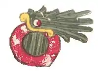 At Teotihuacan the largest mirrors were worn on the back, mirrors were also frequently worn on belts. Mirrors worn as a part of costume frequently had cloth or feather tassels attached. These costume mirrors were forerunners of the Aztec tezcacuitlapilli, which was a mirror worn on the lower part of the back.[51] A number of mirrors were excavated from the Temple of the Feathered Serpent at Teotihuacan. Fifteen individuals were interred with back mirrors placed at the small of the back in Burial 190 alone.[52] Mirrors were additionally worn upon the chest and the representation of chest mirrors upon ceramic figurines is very common.[17] Additionally, circular mirrors were frequently worn as part of a headdress, usually occupying a central position.[19]