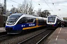 Behind the station building of 1904 there are the four platform tracks at a 230-metre-long platform and a 239-metre-long platform, both 38 cm high.[5] Opposite the station building on the other side of the station forecourt is the platform of the station of the former Moers District Railway (German: Moerser Kreisbahn), now owned by the Niederrheinische Verkehrsbetriebe (Lower Rhine Transport Operations, NIAG). It is still used for special excursions.