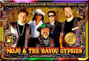 Mojo & The Bayou Gypsies is a band led by Mojo from Breaux Bridge Louisiana. Their music is a blend of zydeco, Cajun and their particular style which he calls Red Hot Mojo Music. Circa 2018, they consist of Mojo on vocals and Cajun accordion, Zydeco T Carrier on Frottoir, Greg Hirte on Cajun fiddle, Tee John Moser on drums, and Beau Brian Burke on bass.