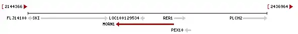 MORN1 is nearby the SKI gene which encodes the SKI protein, LOC100129534, and RER1 gene on the positive strand of chromosome 1.On the minus strand, the PEX10 gene occurs further upstream of Morn1.