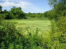 Loantaka Brook Reservation bikeway pond with algae located in Morris Township