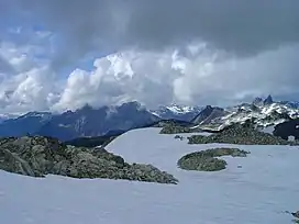 Pali Dome, located north and northeast of Mount Cayley, is an eroded volcano in the central MCVF. Like Cauldron Dome, it consists of two geological units. Pail Dome East on the eastern end of the Powder Mountain Icefield consists of andesite lava flows and small amounts of pyroclastic material. Most of the lava flows form gentle topography at high elevations but terminate in finely jointed vertical cliffs at low elevations. Volcanism probably began at least 25,000 years ago but it could have initiated much earlier.[24] The most recent eruptions produced a series of lava flows when the vent area was not covered by glacial ice. However, the flows show evidence of interaction with glacial ice in their lower units, indicating that they were erupted about 10,000 years ago during the waning stages of the Fraser Glaciation. Ice-marginal lava flows at Pail Dome East form cliffs that reach heights of up to 100 m (330 ft).[24] Pali Dome West consists of at least three andesite lava flows and small amounts of pyroclastic material; its vent is presently buried under glacial ice.[25] The age of the oldest lava flow is unknown but it may be at least 10,000 years old. The second lava flow was erupted when the vent area was not buried under glacial ice. However, the flow shows evidence of interaction with glacial ice at lower elevations, implying that it was erupted during the waning stages of the Fraser Glaciation. The third and most recent lava flow was largely erupted above glacial ice but was probably constrained on its northern margin by a small glacier. Unlike the second lava flow, it was not impounded by glacial ice at lower elevations. This suggests that it was produced by an eruption after the Fraser Glaciation, which ended about 10,000 years ago.[25]