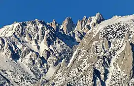 Mount Corcoran is a 13,701-foot (4,176 m) mountain summit located on the crest of the Sierra Nevada mountain range in California.[1] It is situated on the boundary between Tulare County and Inyo County, as well as the boundary between Sequoia National Park and John Muir Wilderness. It is 12 miles (19 km) west-southwest of the community of Lone Pine, 3.6 miles (5.8 km) southeast of Mount Whitney, 1.2 miles (1.9 km) northwest of Mount Langley, and 0.23 miles (0.37 km) immediately south of Mount Le Conte, the nearest higher neighbor. Topographic relief is significant as it rises approximately 1,800 feet (550 meters) above Iridescent Lake in one-half mile.