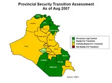 The news media in the United States generally used the term "U.S.-led coalition" to describe Multi-National Force – Iraq, as the vast majority of military forces in MNF-I were contributed from the United States.[6] The majority of countries that deployed military forces to Iraq as part of the MNF-I generally confined them to their respective military installations,[6] due to widespread violence throughout the country.