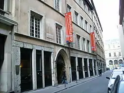 The Musee de l'Imprimerie was established in Lyon because Lyon had been a centre of printing and the book trade in Europe in the 15th and 16th centuries, and the city held large historical collections of books and the graphic arts. The museum was designed by the master printer and historian Maurice Audin, with the historian of the book, Henri-Jean Martin, then chief curator of the Library of Lyon.[3] There are two banners before the entrance of the Hôtel de la Couronne, which hosted the meetings of the City of Lyon aldermen from 1604 to 1655,[4] and which is currently the headquarters of the Musée de l'Imprimerie, located at 13 rue de la Poulaillerie. In 1957, the building was given to the City of Lyon by the banking corporation, LCL S.A., and on 8 June 1963, the mayor of Lyon, Louis Pradel, inaugurated the Musée de la Banque on the occasion of the centenary of LCL. Finally the current museum was opened in 1964.