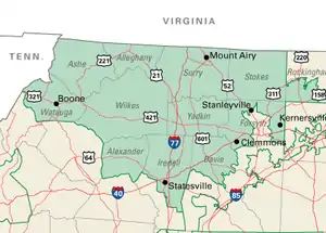 North Carolina's 5th congressional district covers the central western portion of North Carolina from the Appalachian Mountains to the western suburbs of the Piedmont Triad. The district borders Tennessee and Virginia, with the bulk of its territory in the mountains; it stretches just far enough to the east to grab its share of Forsyth County, home to most of its population.
