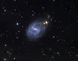 NGC 7741 has a strong bar and two spiral arms. The spiral arms are patchy and diffuse and their inner part forms a pseudoring.[3] There are numerous HII regions along the bar and the spiral arms, and a total number of 10 HII region complexes have been observed, with radius 6 arcseconds. They have ages between 5 and 9 million years.[4] The star formation rate in the central region of NGC 7741 is 0.022 M per year per square kpc.[5] The total stellar mass of NGC 7741 is estimated to be 1.69×109 M.[6]