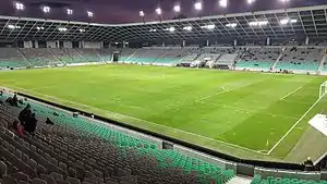Stožice Stadium is a football stadium located in Ljubljana with a capacity of 16,038 covered seats.[5] It was designed by the Sadar + Vuga architecture bureau and is the biggest Slovenian football stadium.[44] It opened in August 2010 and lies in the Bežigrad district, north of the city centre.[4] Together with an indoor arena, it is a part of the Stožice Sports Park. The stadium also has 558 VIP seats and 97 spots for persons with disabilities.[5] Olimpija played its first match at the new stadium on 22 August 2010, in front of 7,000 spectators in a league match against Koper.[45] The record home attendance was set in 2014, when 15,972 spectators gathered to watch Olimpija play against English Premier League side Chelsea in a friendly match.[4] The stadium is also used as the main venue for home matches of the Slovenia national football team, as well as for many cultural events such as music concerts.