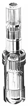 The reactor was de-fuelled in 1975. It was removed and taken to Utah for disposal in November 2022. The reactor was 17 ft (5.2 m) high with a core 62 in (160 cm) in diameter and 66 in (170 cm) high, with 32 fuel elements. Each fuel element was 1⁄2 in (13 mm) in diameter and housed 164 uranium oxide pellets enriched to an average of 4.4% U-235. The 16 center elements were enriched to 4.2%, and the outer 16 elements to 4.6%. The pellets were 0.4244 in (10.78 mm) in diameter, with pressurized helium gas in the annular space between the pellets and the element walls. Twenty-one control rods were provided, 66 in (170 cm) long, 8 in (20 cm) across and 3⁄8 in (9.5 mm) thick. The rods could be fully inserted in 1.6 seconds by electric drive.[10]