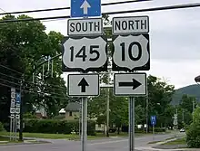 The first change to the routing of NY 10 came by 1926 when NY 10 was extended northeastward over modern NY 3 to Plattsburgh, where it terminated at NY 30 (now NY 22).[7] The route was truncated one year later when US 9W was assigned to the portion of NY 10 between New Jersey and Albany. NY 10 was subsequently truncated to the former western terminus of its overlap with NY 5 in Schenectady.[8] In the 1930 renumbering of state highways in New York, NY 10 was significantly reconfigured to begin in Deposit and end at the Canadian border north of Malone. The only segment of NY 10 not altered by the realignment, which utilized a combination of previously numbered routes and unsigned roadways, was the piece between Long Lake and Lake Clear Junction.[9]