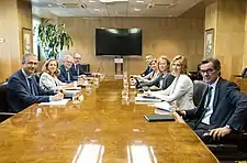 In June 2018 Calviño was chosen by Prime Minister Pedro Sánchez to be part of his new government as Minister of Economy and Business of Spain, following the motion of censure that the PSOE presented against the previous government of Mariano Rajoy (PP) and that was approved by the Congress of Deputies on 1 June 2018.[7] Thus, on 7 June she took office as Minister of Economy and Business before the King at Palace of Zarzuela.[8][9]