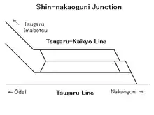 Shin-Naka-Oguni Junction (新中小国信号場, Shin-Nakaoguni Shingōjō) is located 2.3 km north of Naka-Oguni, between Naka-Oguni and Ōdai / Tsugaru-Imabetsu. Up until this point, the Tsugaru Line and Kaikyō Line shared the same tracks from Aomori Station. The junction also marks the border between the electrified portion of the Tsugaru Line (Aomori to Naka-Oguni) and the non-electrified portion (Naka-Oguni to Minmaya), as well as the border between JR East and JR Hokkaido. Also, The Hokkaido Shinkansen tracks from Shin-Aomori Station merge with the Kaikyō Line tracks immediately north of the Junction.
