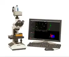 Each instrument comprises a scientific camera, a microscope,[4][5] and a sample viewing unit (LM12 or LM14). The viewing unit uses a laser diode to illuminate particles in liquid suspension that are held within or advanced through a flow chamber within the unit. The instrument is used in conjunction with a computer control unit that runs a custom-designed Nanoparticle Tracking Analysis (NTA) software package. NTA analyzes videos captured using the instrument, giving a particle size distribution and particle count based upon tracking of each particle's Brownian motion. Tracking is carried out for all particles in the laser scattering volume to produce a particle size distribution using the Stokes-Einstein equation, relating the Brownian motion of a particle to a sphere-equivalent hydrodynamic radius.