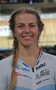 She worked as a veterinary surgeon before becoming a full-time athlete in 2017.[6] Evans raced in every round of the Revolution series as she helped Podium Ambition win the overall Elite women's title. Evans notably placed her team first in round three despite being on her own;[7] and beat Laura Kenny in the omnium event in London.[8] At the London 6 days event, Evans won one of the ten races to finish second in the women's omnium to Katie Archibald.[9][10] Evans was selected to represent Britain at the Cali World Cup event in 2017.[11]