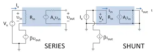 Negative-feedback amplifiers of any type can be implemented using combinations of two-port networks. There are four types of two-port network, and the type of amplifier desired dictates the choice of two-ports and the selection of one of the four different connection topologies shown in the diagram. These connections are usually referred to as series or shunt (parallel) connections.[29][30] In the diagram, the left column shows shunt inputs; the right column shows series inputs. The top row shows series outputs; the bottom row shows shunt outputs. The various combinations of connections and two-ports are listed in the table below.
