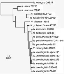 Phylogenetic tree of selected Neisseria species, based on concatenating the DNA sequences of all 896 core Neisseria genes, from Marri et al. 2010[3]
