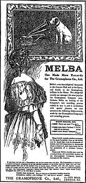 Melba made numerous gramophone (phonograph) records of her voice in England and America between 1904 (when she was in her 40s) and 1926 for the Gramophone & Typewriter Company[65] and the Victor Talking Machine Company. Most of these recordings, consisting of operatic arias, duets and ensemble pieces and songs, have been re-released on CD.[66] The poor audio fidelity of the Melba recordings reflects the limitations of the early days of commercial sound recording. Melba's acoustical recordings (especially those made after her initial 1904 session) fail to capture vital overtones to the voice, leaving it without the body and warmth it possessed – albeit to a limited degree – in life. Despite this, they still reveal Melba to have had an almost seamlessly pure lyric soprano voice with effortless coloratura, a smooth legato and accurate intonation.[66] Melba had perfect pitch; the critic Michael Aspinall says of her complete London recordings issued on LP, that there are only two lapses from pitch in the entire set.[67] Like Patti, and unlike the more vibrant-voiced Tetrazzini, Melba's exceptional purity of tone was probably one of the principal reasons why British audiences, with their strong choral and sacred music traditions, idolised her.[68]