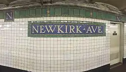 The platforms have their original 1920s tiling from the Dual Contracts era. The "NEWKIRK AVE" name tablets are on a blue background with a green border. The station's trim line is nearly fully green with accents of several other colors. "N"s for "Newkirk" run along the trim line at regular intervals. The platform columns run at regular intervals and are painted green to match the station's tiling. They are wider in the middle of each platform where the station exits and fare control are. They get narrower as they run toward either end of the platform, especially at the extreme ends where the 1960s extension refrigerator-block style tiling is used. The columns have "Newkirk" written in white on a blue plate.