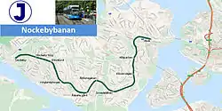 Nockebybanan is a tram line between Nockeby and Alvik in the western suburbs of Stockholm, Sweden. The 5.6 kilometers (3.5 mi) long line is part of the Storstockholms Lokaltrafik public transport network, and connects with the Stockholm metro and Tvärbanan tram at Alvik metro station. The Nockebybanan, also known as line 12, is operated by Arriva.[2][3]