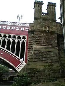 North Bridge was designed in Victorian Gothic style by brothers John and James Fraser of Leeds. John had considerable experience of railway bridge design. Two 160 feet (49 m) spans of semi-elliptical arch ribs are supported by stone piers with ecclesiastical style buttresses, carrying a 60 feet (18 m) wide roadway. There are lancets in the spandrels. The parapets are richly decorated with quatre-foil piercings with central Maltese crosses and tri-foil pattern railings above with a crenellated top rail. The mainly cast iron parapet ribs have a wrought iron central section of 56 feet (17 m).[2] The central pier stands 75 feet (23 m) high and the bridge was built 11 feet (3.4 m) higher than its predecessor so that the Halifax and Ovenden Joint Railway could pass underneath the northern end. North Bridge Station was just east of the bridge, extending under it. A drinking fountain, named for James Oates who worked on the bridge, is set into the south west turret of the bridge. The cost of the bridge was £21,000 or 17 shillings and six pence per square foot of roadway, claimed to be the cheapest bridge in England at the time.[1]