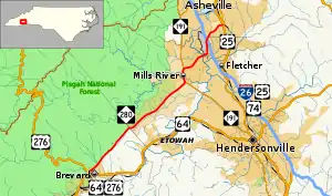 Although the highway runs primarily through rural farming and residential areas for most of its length, the stretch between Fanning Bridge Road and US 25 currently represents the most developed section of the highway. A growing number of national retailers, restaurants, and hotels can be found within a half-mile of the I-26/US 74 interchange.[3][4] Landmarks along this section of highway include Asheville Regional Airport and the WNC Agricultural Center, site of the annual North Carolina Mountain State Fair. For 10.1 miles (16.3 km) of its path through Transylvania and Henderson counties, the highway runs adjacent to the eastern boundary of Pisgah National Forest.[1]
