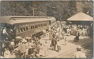 The NSR was operated by John Martin and Eugene de Sabla Jr., pioneers in the electric railroad business. The southern 23 miles (37 km) of line were modernized to allow operation of standard-gauge electric passenger cars in addition to narrow-gauge steam-powered freight trains. Electric cars sometimes shared dual-gauge tracks with the steam trains, while at other locations a separate track for the electric cars was constructed parallel to the narrow-gauge route. The line was ultimately double tracked from Sausalito to San Anselmo except for the tunnel at Alto. A power house was built at Alto and power was also purchased at San Rafael. Direct current electrical power was transmitted to the trains at 600 volts by a third rail (which was actually a fourth rail on the dual-gauge segments.)[4] Service started to Mill Valley on August 20, 1903, and to San Rafael on October 17, 1903. It was the first United States steam railroad electrified for operational efficiency rather than for smoke abatement. The railroad established practices later used in Grand Central Terminal and the interborough subways of New York City.[5] The electric lines were expanded after 1907 as part of the Northwestern Pacific Railroad. Interurban services ceased on February 28, 1941.[6]