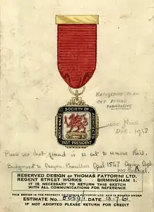 The Society's Presidential Chain of Office was designed in 1954 by Fattorini and Sons of Birmingham of hallmarked sterling silver finished in polished hard gold plate and vitreous enamelled in three colours. Between 1961 and 1994 the Society presented a Past President Medal, similarly designed and produced by Fattorini. This custom was reinstated in 2017.